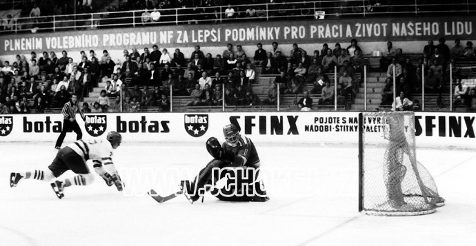 Co ale nechtěl čert, bylo toho příliš a otupělí občané přestávali zaměřovat pozornost na všechno rudé a žluté, stejně jako dnes namnoze nesledují všudypřítomná komerční sdělení. Fotografie pořízená 3. září 1983 naštěstí připomíná také parádní hokej, který v tomto případě vystřihne reprezentační mužstvo Československa, jehož dres oblékají i motoráci Jiří Lála, Vladimír Caldr nebo Jaroslav Korbela. Spoušť analogového aparátu Milana Šímy cvakne přesně ve chvíli, kdy brankář východoněmeckého Dynama Berlín inkasuje jeden z devíti gólů. Čechoslováci zvítězí 9:1, střelbu zařídí Vladimír Růžička (3), František Musil, Pavel Richter, Darius Rusnák, Vladimír Caldr, Jiří Lála a Milan Chalupa.