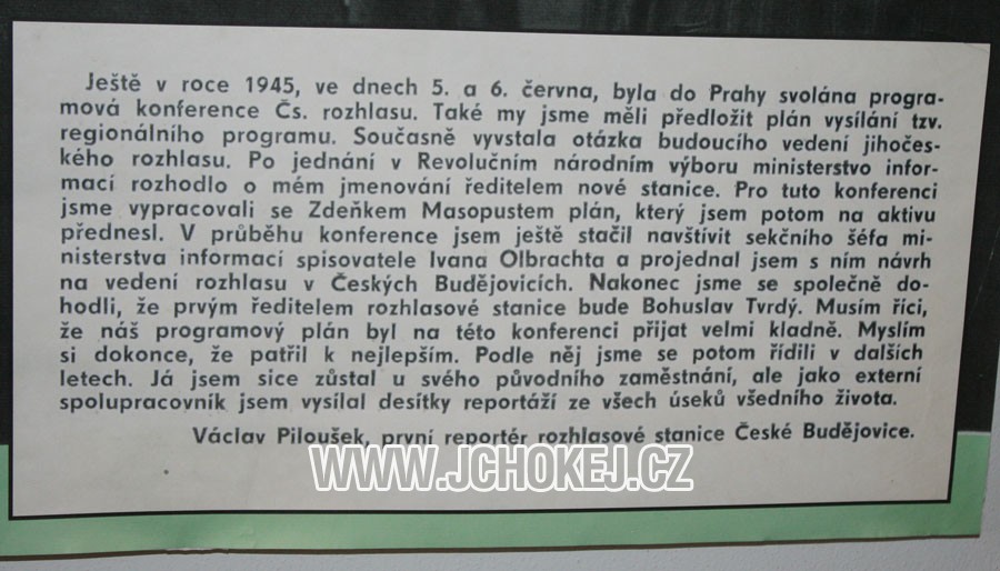 Aktuální výstava „70 let na jihočeské vlně“ otevřená v Jihočeském muzeu od 15. dubna do 7. června připomíná kulaté výročí prvního vysílání Českého rozhlasu v Českých Budějovicích a nabízí také hokejovým fanouškům, především milovníkům historie tohoto sportu, jedinečnou příležitost důvěrněji poznat osobnost a uslyšet hlas Václava Pilouška, jenž byl prvním trenérem někdejšího AC Stadionu, ale i prvním zdejším „rozhlasákem“.