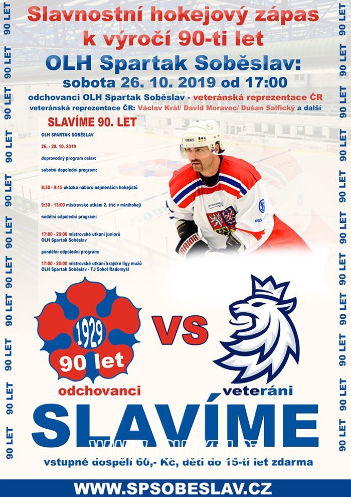 Spartak Soběslav přichystal oslavy devadesátého výročí ledního hokeje ve městě, které v posledním říjnovém víkendu nastaveném o sváteční pondělí 28. října spojí s oficiálním otevřením zimního stadionu po nákladné rekonstrukci. Součástí třídenního maratonu bude několik mistrovských zápasů soběslavské mládeže a pro diváky velmi lákavý duel domácích veteránů s Old Timers České republiky. Nebude chybět společenský večer, fanoušci si zakoupí speciální suvenýry.