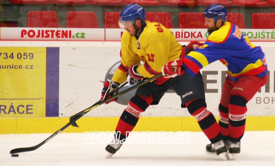 Č. BUDĚJOVICE – Podle jmen a rozložení sil v jednotlivých pěticích se nedalo předpokládat, že Modří tak výrazně přestřílí Žluté. Nenapovídal tomu ani začátek utkání, které se měřilo na dvakrát třicet minut hrubého času. Modří sice získali dvougólový náskok, ale první trefou Žlutých odpověděl Aleš Kotalík. Teprve poté se vývoj zlomil a góly začaly padat skoro výhradně na jednu stranu. Hráčům v modrých dresech vycházelo, na co sáhli. Žlutí skórovali podruhé až za stavu 1:9 a chvíli zlobili. Poslední čtyři přesné zásahy však znovu patřily Modrým.
